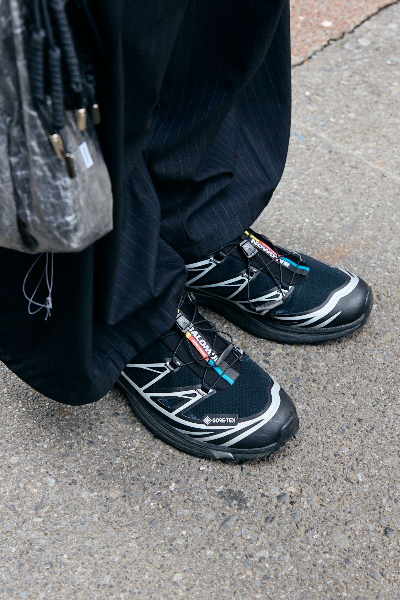 足元のサロモンがスポーティな躍動感をもたらし、ネイビートーキョーのバッグやアヤメの眼鏡がアーバンな魅力を後押しする。
