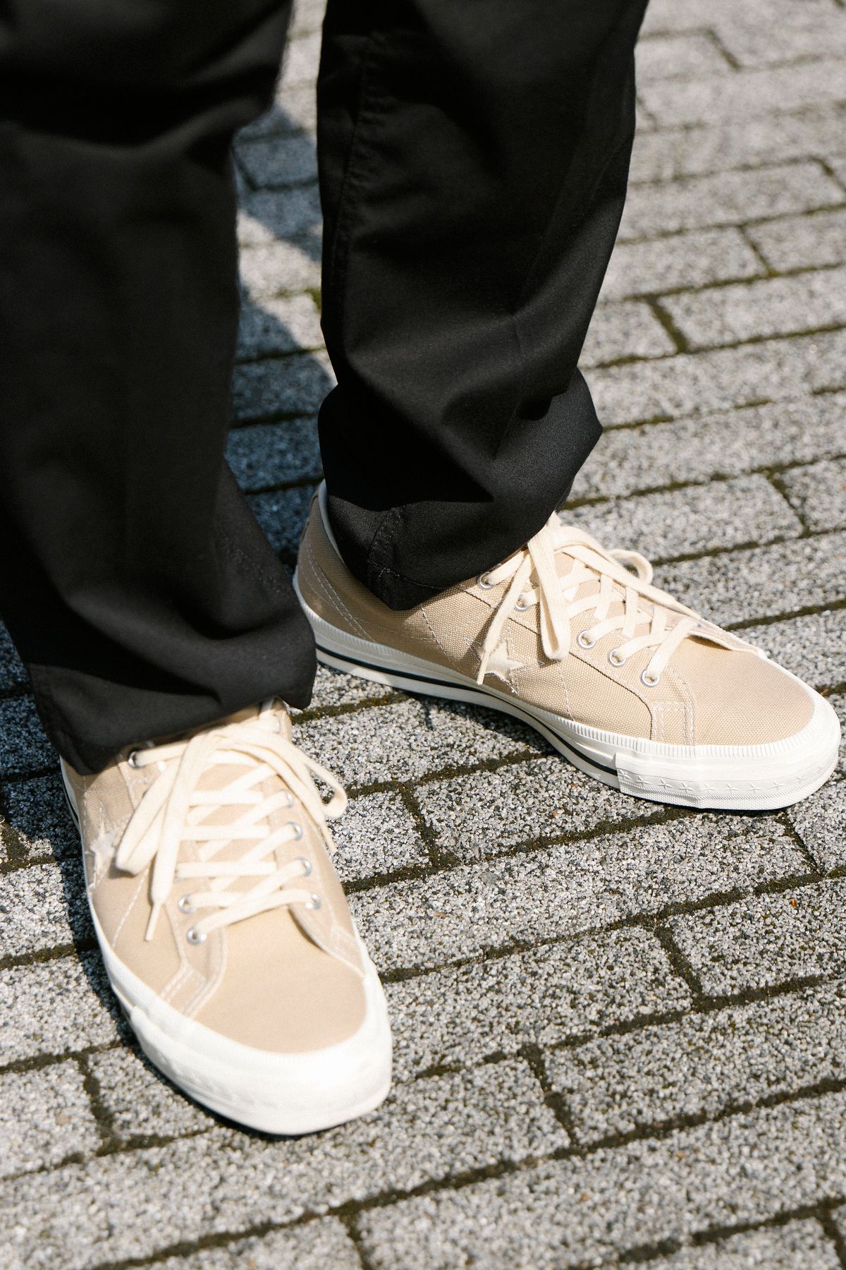 足元にはコンバースのスニーカーを合わせて軽快な足取りを確保。モスコットの眼鏡が顔まわりに知性を与え、グランドセイコーの腕時計が上質な時間を刻み続ける。