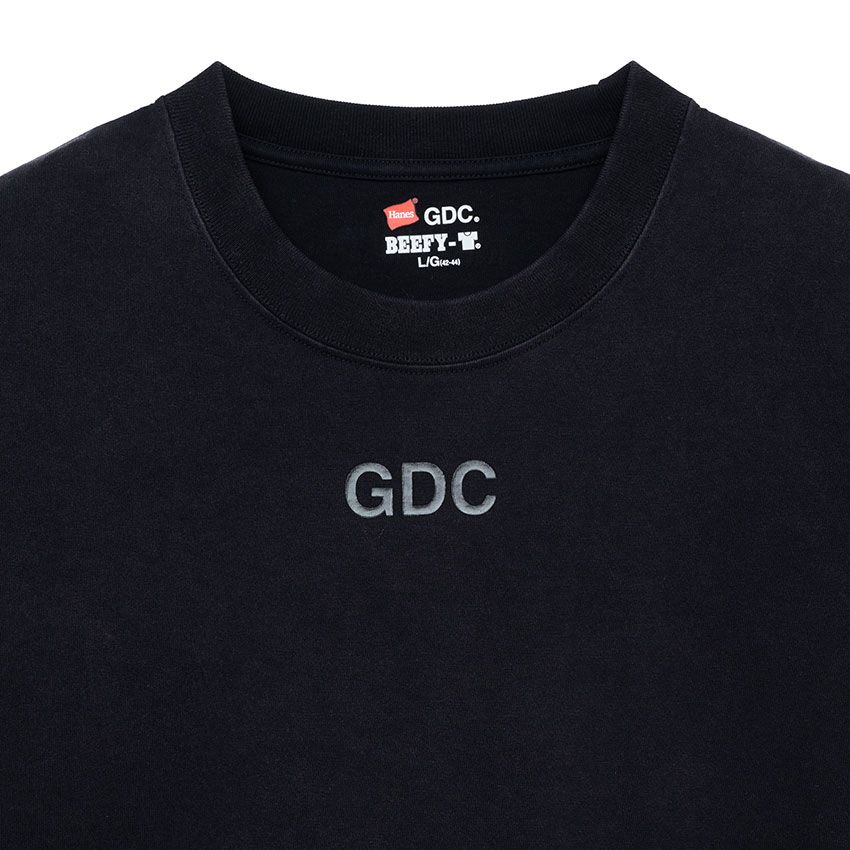 肉厚なコットン100%のボディは、タフな着用にも耐える強さと、着込むほどに体へ馴染む経年変化を兼ね備える。丸胴編みによるストレスのない着心地やタグレス仕様といったヘインズらしい完成度の高さはそのままに、「GDC」ならではのミニマルな美意識が落とし込まれている。