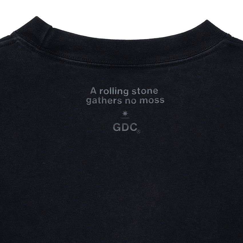 フロント胸元には控えめにGDCロゴを配置し、背面ネックには“A rolling stone gathers no moss”のレターグラフィックをプリント。削ぎ落とされたデザインの中に、ブランドの思想をさりげなく忍ばせた。