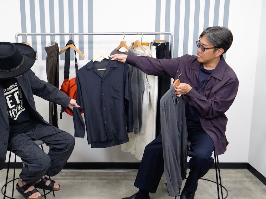 左から「アンセルム」のタンクトップ、「理容室ハンサム」のオリジナルスウェット、「イレーヴ」のシルクシャツ&「スティーブンアラン」のシャツ