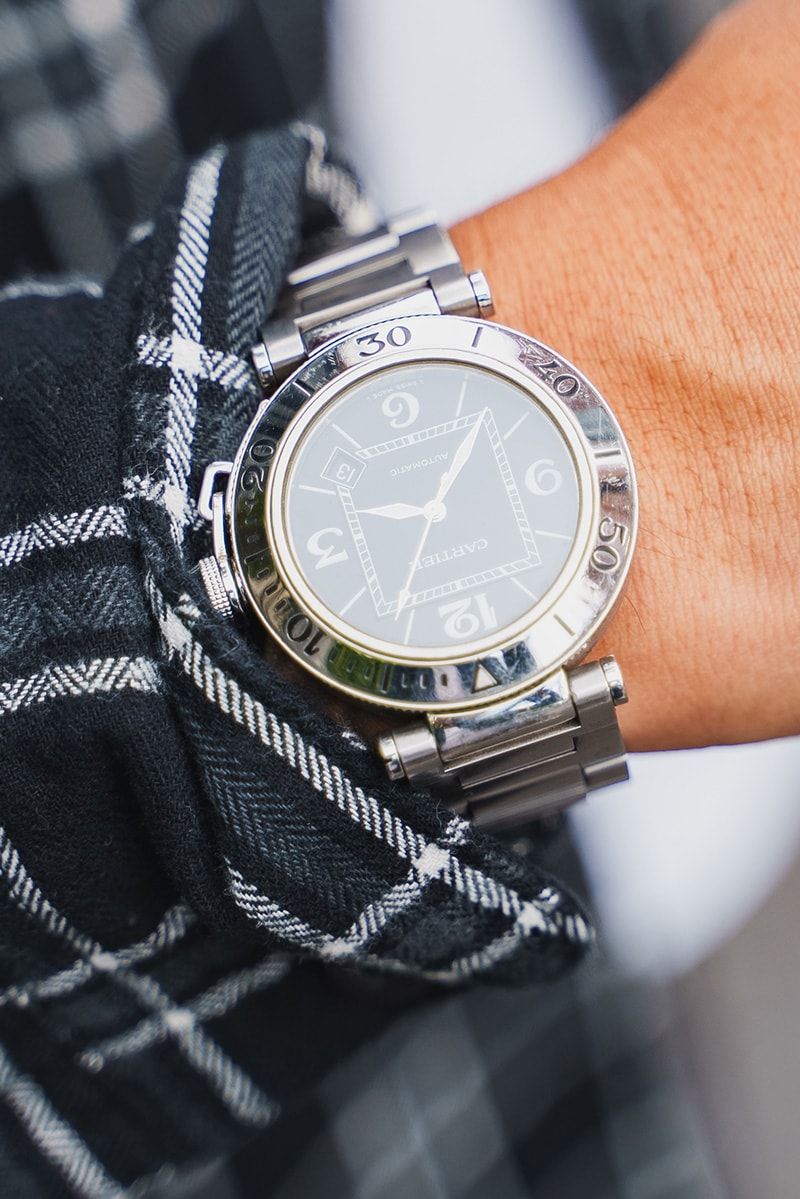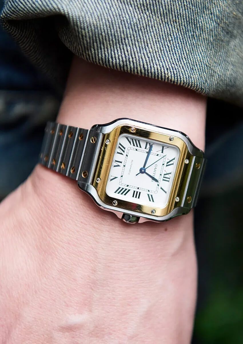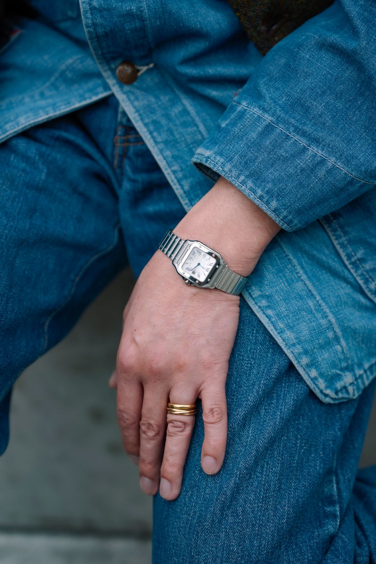 【写真11点】「カルティエの腕時計「サントス」「パシャ」はデニム合わせにも人気」の詳細を写真でチェック美しい輝きを放つカルティエの時計は、リラックスした日常着と組み合わせることで真の魅力を発揮する。ラフなデニムスタイルに、あえてドレッシーな時計を添えるアプローチは、装い全体を瞬時に格上げする魔法のテクニックだ。