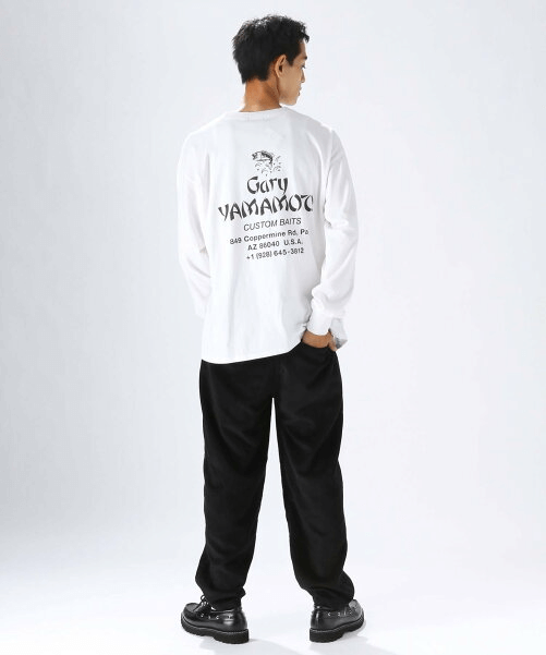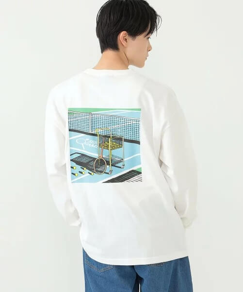 画像の白ロンTは前身に小さなロゴがついて、背面には大きくプリントされたイラストが、自己主張し過ぎず大人のメンズにおすすめできます。