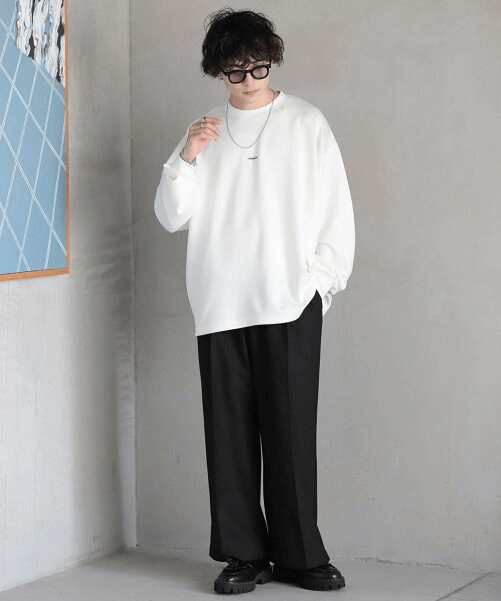 伸びのあるゆったりとしたシルエットとロンTがカジュアルで、光沢のあるパンツとシューズ使いで大人っぽい印象になります。
