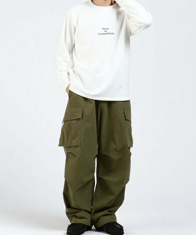 特にワイドなシルエットのパンツや、流行りのミリタリーっぽいボトムスはコーデのおしゃれ度を一気に上昇させてくれます。足元はレザーシューズで締めることでダボっとしすぎることなくコーデのバランスが取れます。