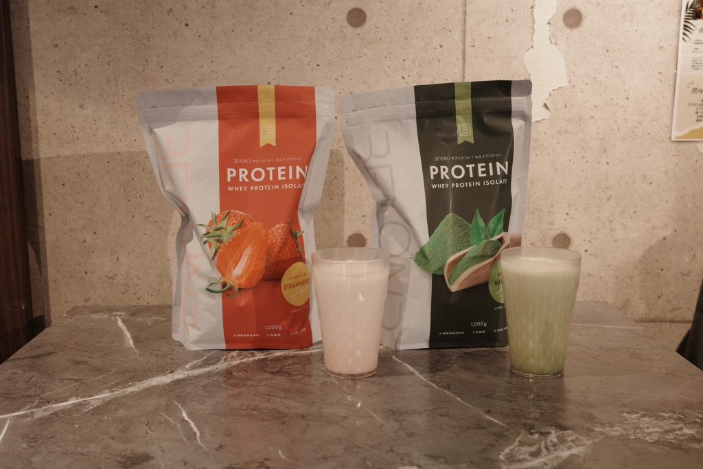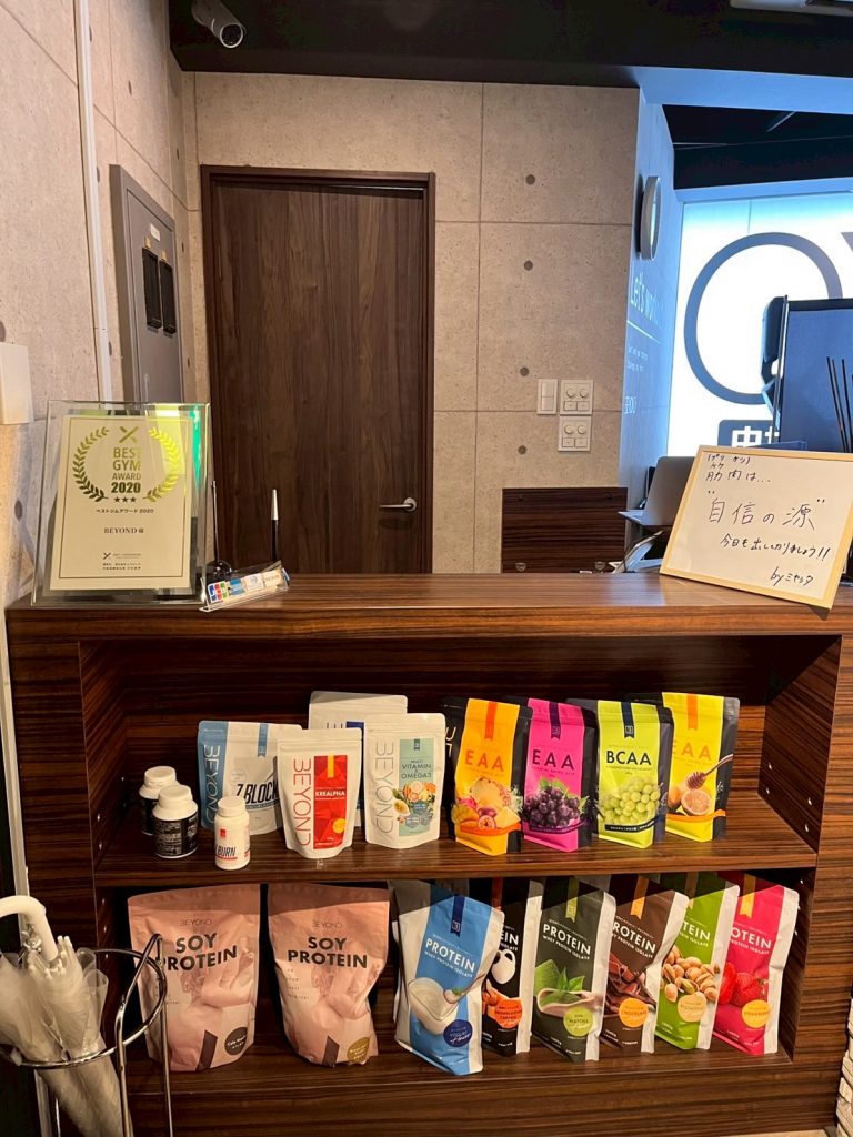 運動後にBEYONDオリジナルのプロテインを飲むことができます!個人的には抹茶のプロテインがとても飲みやすくておすすめです!