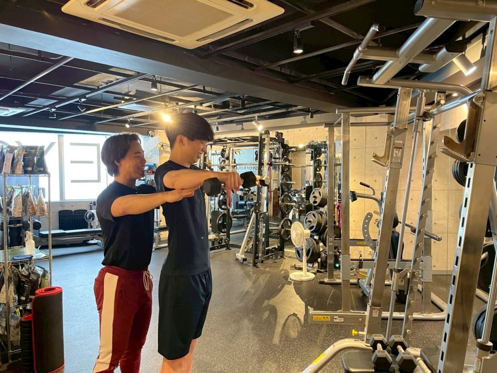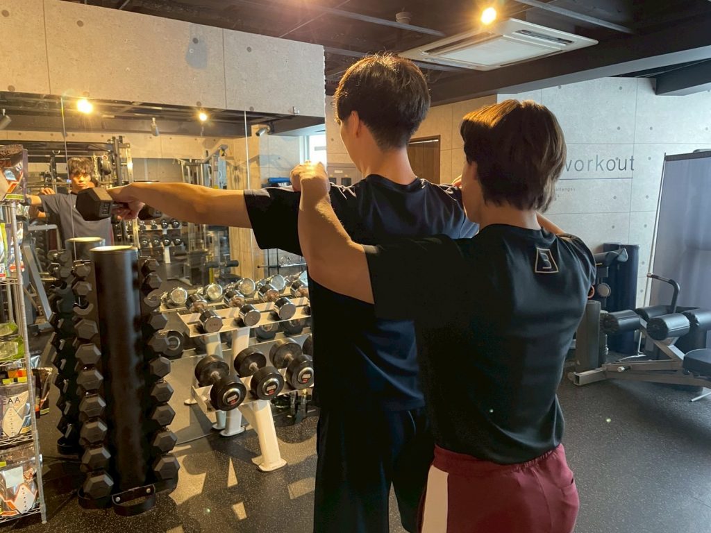 肩のトレーニングでは、ダンベルを使って肩を鍛えました。トレーナーが「ここで肩が上がらないように!」と指導してくれるおかげで、正しいフォームでしっかりトレーニングを行うことができました。