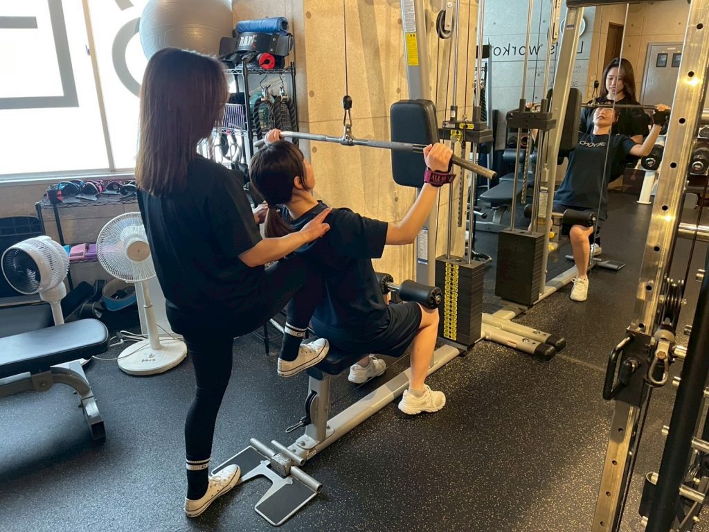 背中のトレーニングでは、マシンを使いながらしっかりと鍛えることができました。背中が丸まらないように気をつけて行い、すごく胸張るので普段の姿勢の悪さとかも矯正される感じもあり日常生活でも姿勢を意識しないとなと感じました。