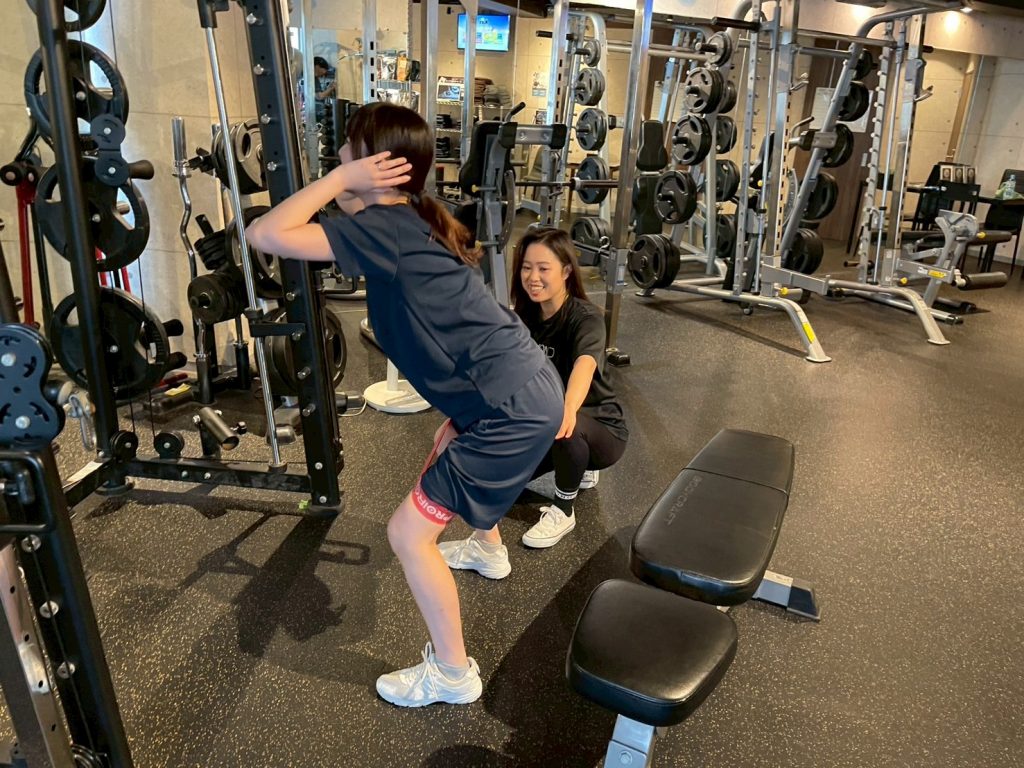 下半身のトレーニングでは、片足スクワットやゴムを使ったスクワット、バーベルを使ったスクワットを行いました。これらは普段あまり鍛えない部位なので、翌日には筋肉痛がひどくなり、しっかり効いた証拠を実感しました。ヒップアップや太ももの引き締め効果を実感できたのが嬉しかったです。トレーナーが適切なフォームを教えてくれたおかげで、効果的なトレーニングができましたし、綺麗にできていると褒めてくださったのできつくても頑張れました!