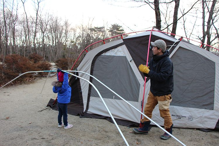 「ひと通りリフレッシュしたら、いよいよテントやタープを設営します。このときのポイントは、親だけで設営しないこと。ただし、頭ごなしに教えるのではありません。ペグ打ちを任せたり、一緒にテントの向きを考えたり……一つひとつの作業が、キャンプの遊びの一部なんです」。