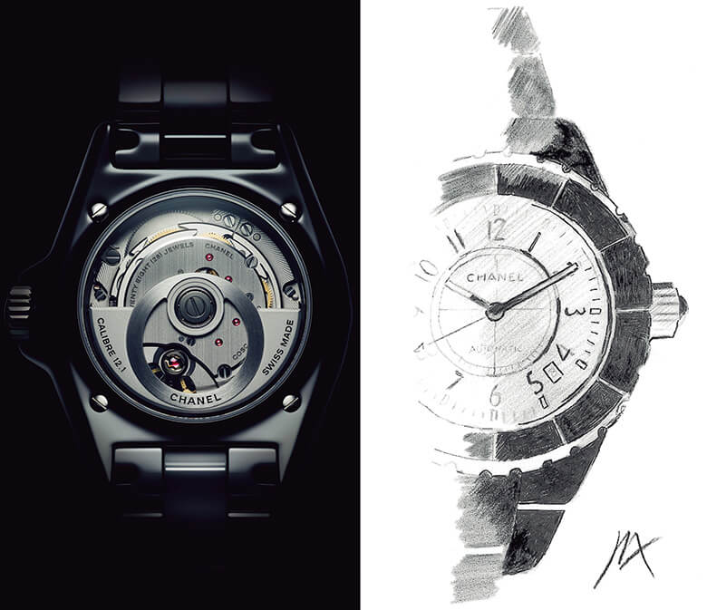 [左]搭載する自動巻きムーブメントは、シャネルのウォッチメイキングのシグネチャーのひとつである“円”を強調したデザイン。クロノメーターを取得し、70時間のパワーリザーブを備える。